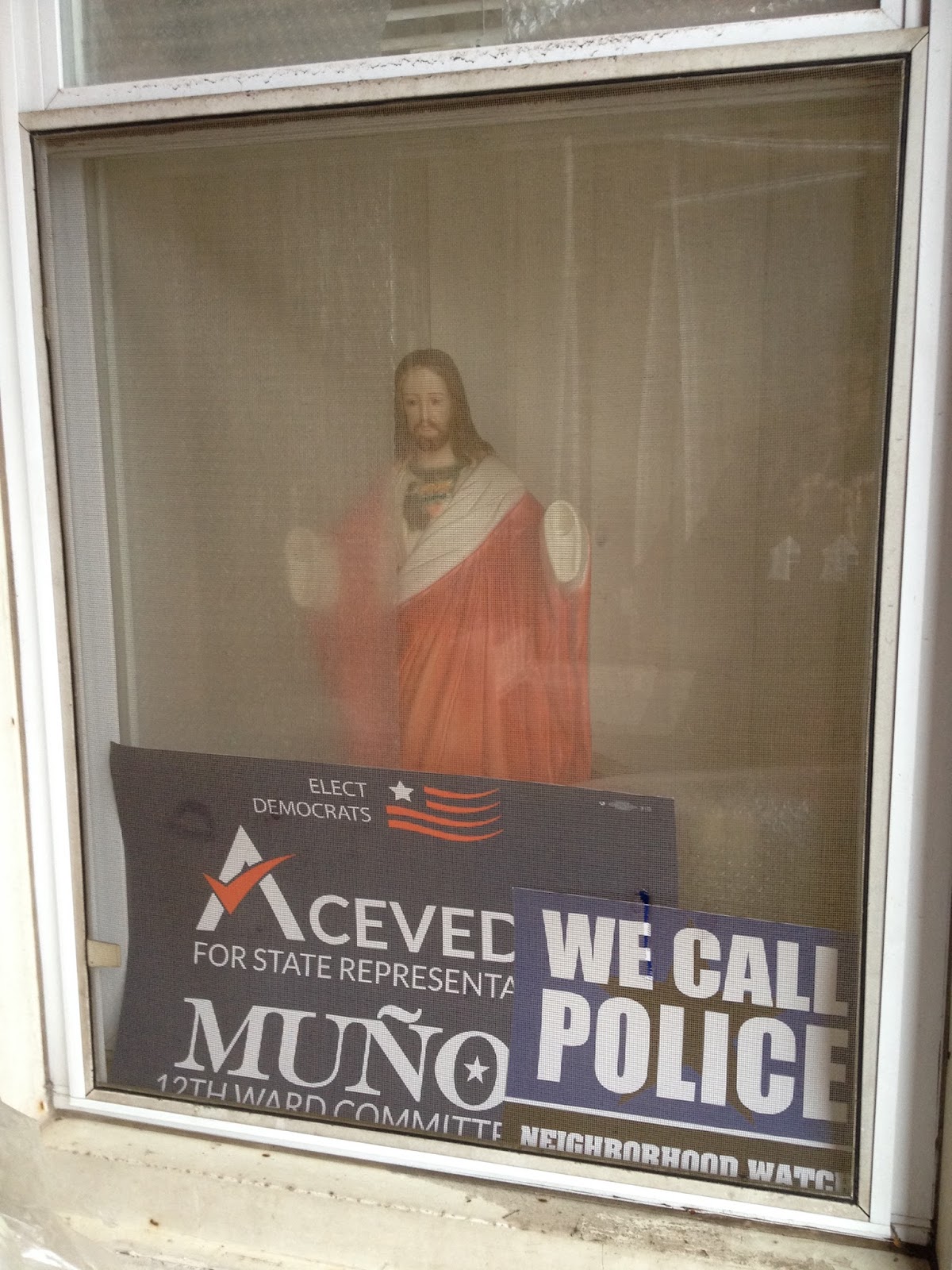 hands. / Un Jesús sin manos hace guardia en la ventana de una casa en Brighton